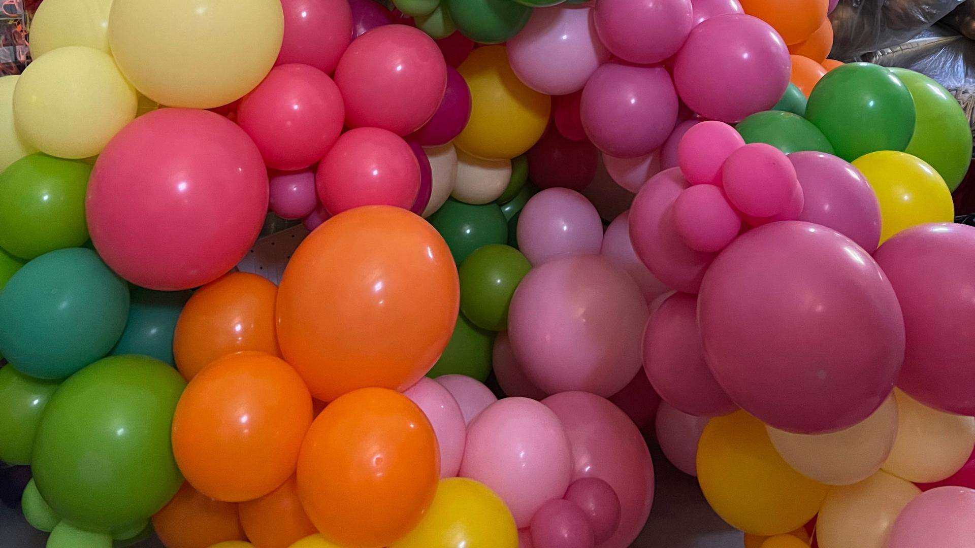 Balloon strands cascade from a truss or pipe grid, turning open air into a backdrop without using floor space.